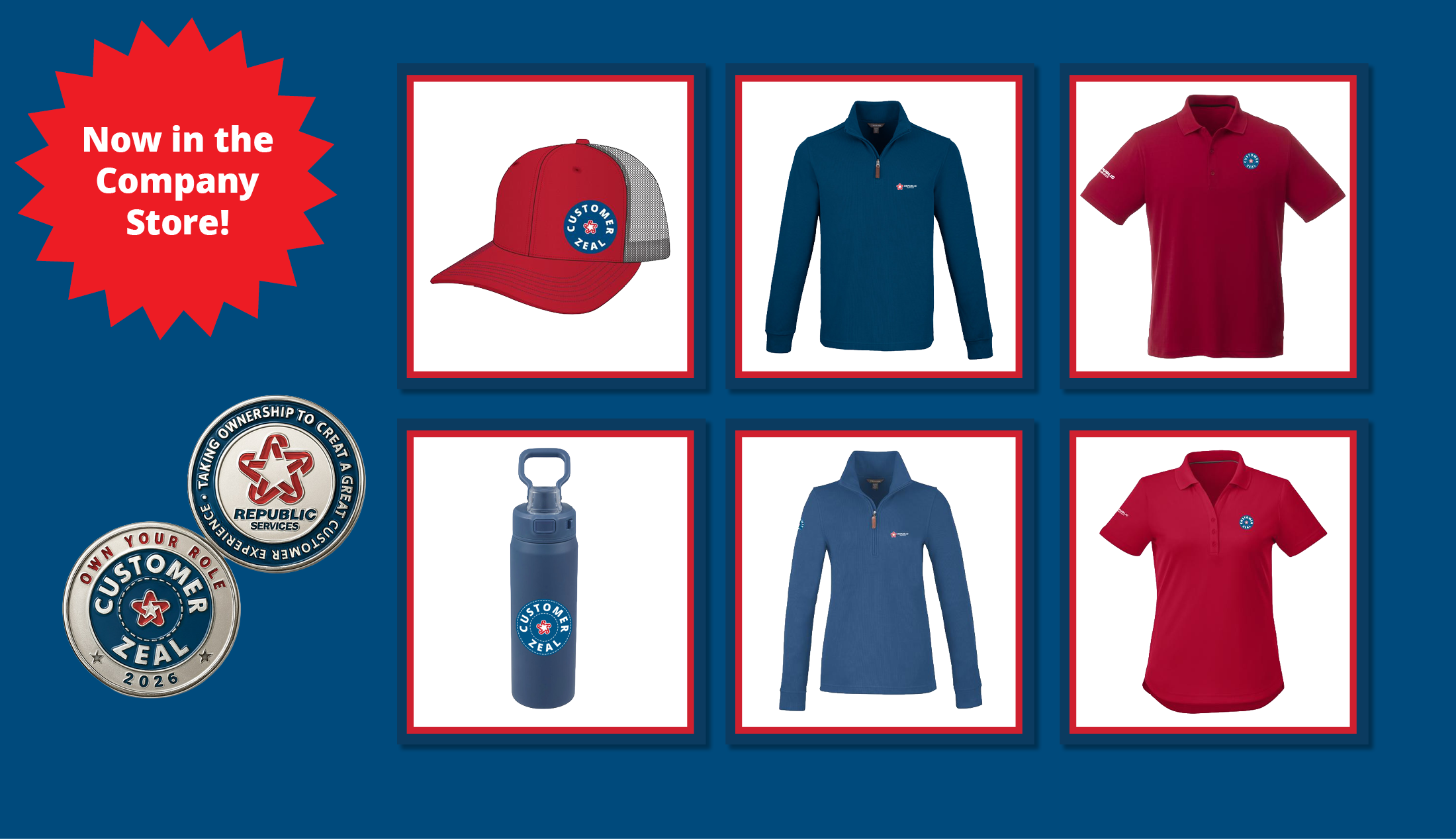Show your Customer Zeal pride with new additions including a baseball cap, water bottle, polo, quarter zip and 2026 Customer Zeal coins (coins are available for pre-order and ready to ship April 8.)