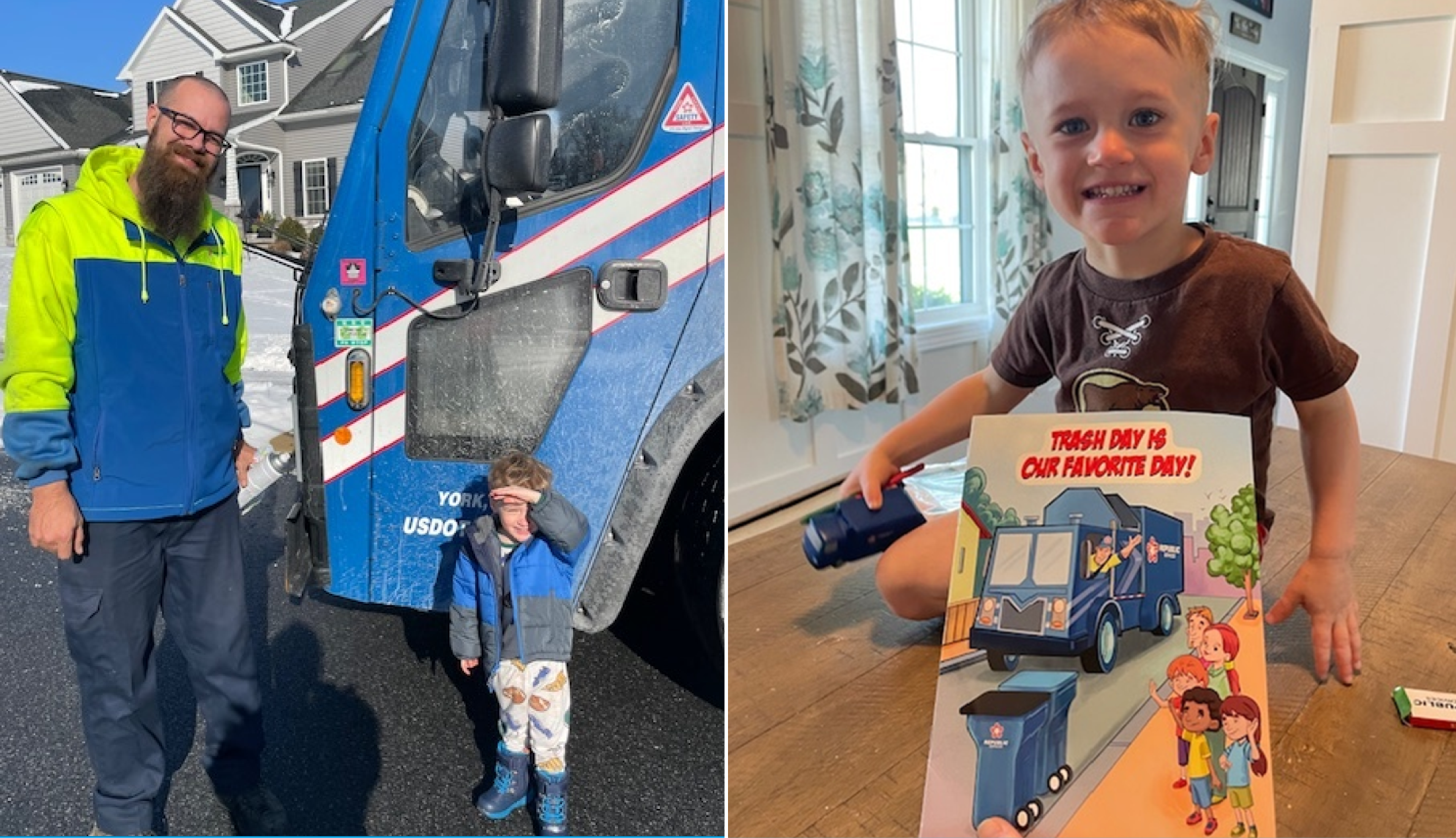 Driver Derek W., out of Marietta, Pennsylvania, has a huge fan on his route. Every week, Bryson runs to the window to watch Derek pick up the trash on his street. Recently, Derek stopped to give Bryson some Republic Services gear. Bryson couldn’t have been happier!