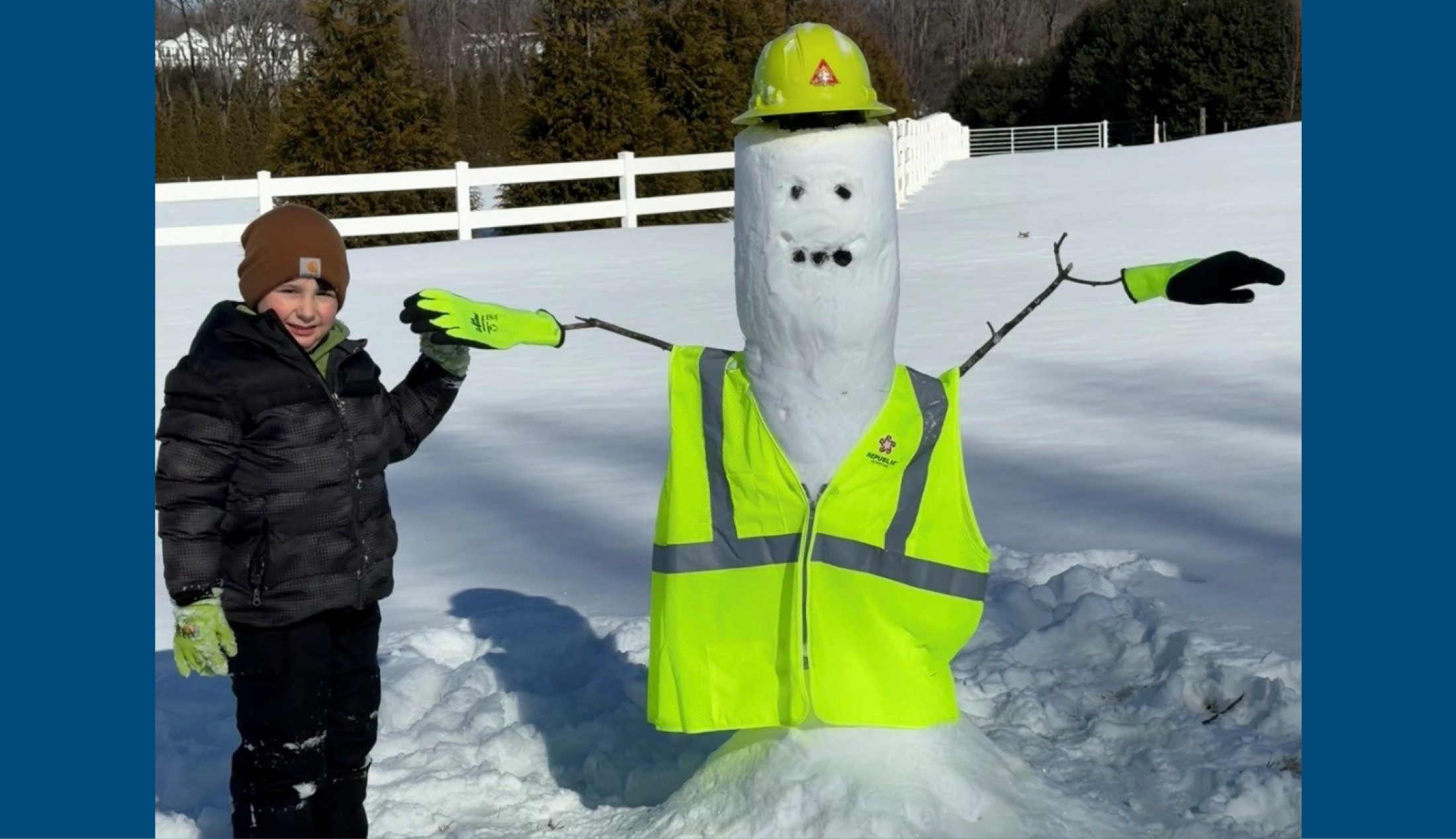 A big thank‑you to Melody C., Logistics Analyst, for sharing this adorable photo of a safety first snowman expertly built by her son, Lincoln (age 6). Dressed head‑to‑toe in proper safety gear, this frosty teammate is prepped for a safe day ahead!